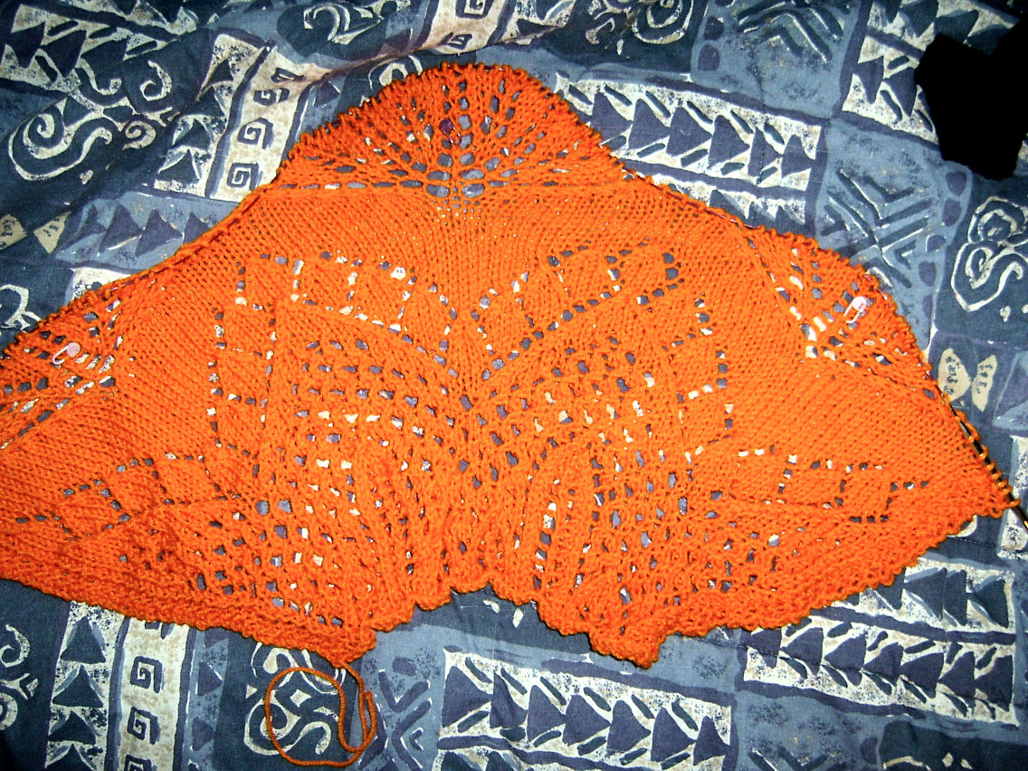 I added some increases along the edges in the netting section to build up to the chevron. Somewhere along the way my chevron ended up a few stitches wider than the original so there is one more diamond along the sides and a few more rows getting to the peak. It all worked out so I'm not going to worry about it, even if I do end up going WTF about the whole thing. You can also see the start of the final motif forming between the chevron points, and how the edge of the final shawl will be scalloped.